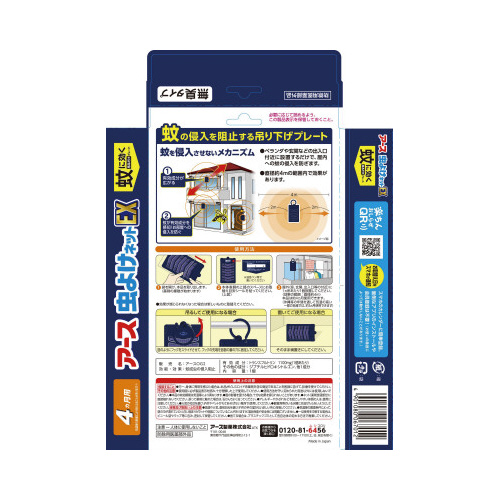 蚊の侵入を阻止する虫よけ吊り下げプレート。ベランダ、玄関などの出入口付近に設置するだけで、屋内への蚊の侵入を防ぎます。直径約4mの範囲で効果があります。雨にぬれても大丈夫。無臭タイプ。