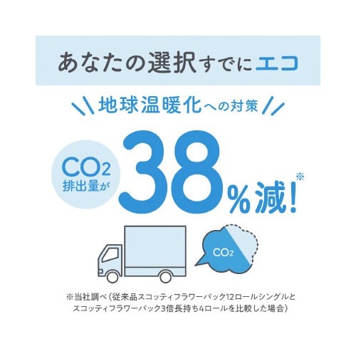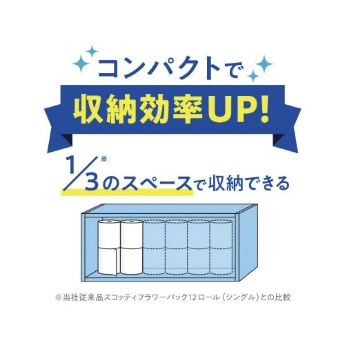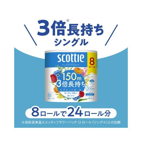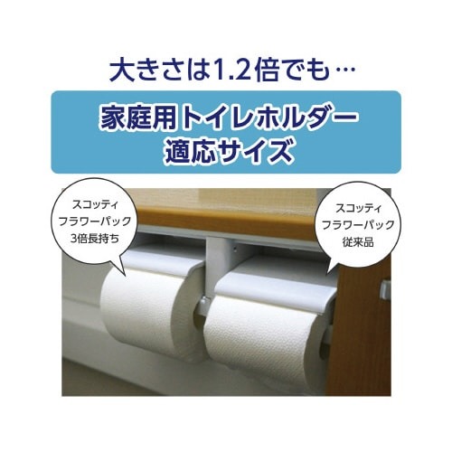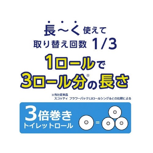 8ロールで24ロール分の長さ(※当社製品比)のトイレットペーパー。1ロールで3ロール分だから、取り替えの手間が減り、収納スペースも1/3に収まります。家庭用ホルダー適応サイズ。くつろぎの花の香り付き。