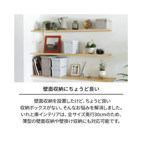 奥行30cmのため、シューズボックスや壁面収納などにピッタリなサイズ。インテリアに馴染む2色展開となり、”隠す収納”としてもスッキリ整います。再生材20%を使用しているため、環境にもやさしいです。