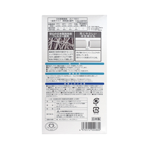 ●材質/本体:不織布(ポリプロピレン、ポリエステル)、耳ひも:ポリエステル、ポリウレタン、ノーズワイヤー:ポリエチレン