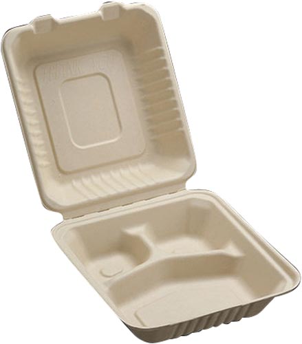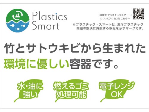 成長サイクルの早い竹を使用したエコ弁当容器。バガスモールドより強度がある竹とバガス(搾りかす)の混合素材。レンジ可。容量約450g。PlasticsSmart(プラスチックスマート)参加商品です。