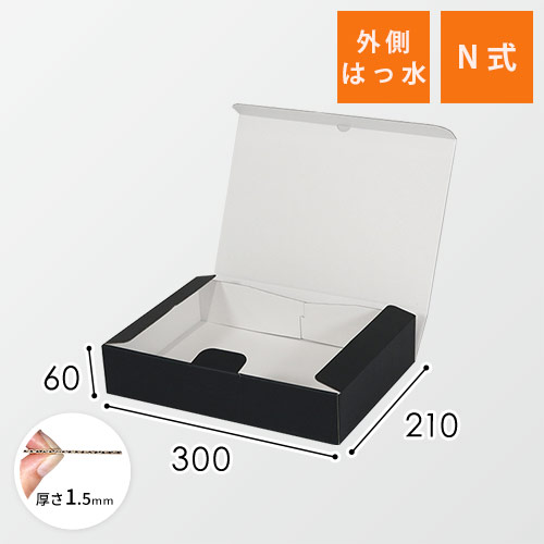 材質はE/F(1.5mm厚)のダンボールで、表面の色は高級感のある黒・内側の色は白です。