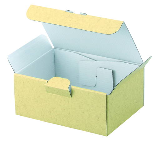 材質は2.5mm厚のダンボールで、表面の色はクリーム(少し柄あり)・内側の色は白です。