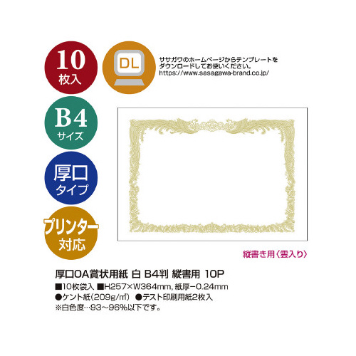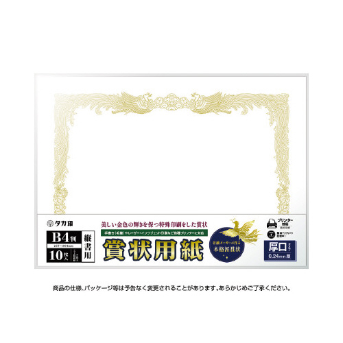 しっかりとした厚みのある高級賞状用紙です。幅広い用途のベーシックなホワイトベース。美しい金色の輝きを保つ特殊印刷をした賞状です。OA対応です。従来からの手書きや通常印刷にも使用できます。