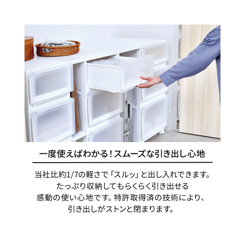 「丈夫さ」と「安心」にこだわった収納ケースです。クローゼット収納に最適。たっぷり収納してもスルッと引き出せる、感動の使い心地を実現しました。天板のたわみを防ぐために、アルミ補強板を内蔵しています。