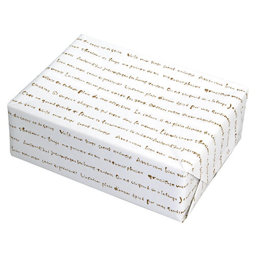 サイズが788×530mmの包装紙。材質は紙で、表面の色は使い勝手の良い白色です。茶系のフランス語で「伝わりましたか?私の大切な真心やあなただけに伝えたい私の本当の真心」等記載あり。ギフトボックスなどのラッピングにいかがでしょうか。リボンや紐などでアレンジも◎その他に色違いの茶色(クラフト)もご用意しております。