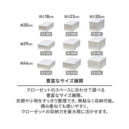 クローゼット収納に最適な収納ケースです。積み重ねてもたわみにくい丈夫な前枠付き。上下凹凸を施している為、積み重ねてもぴったりフィット。前倒れ防止機能付き。別売りキャスターを付けることもできます。