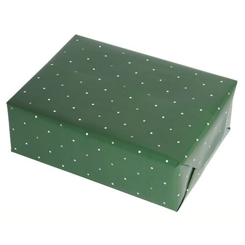 サイズが788×530mmでドット柄の包装紙。材質は紙で、表面の色は落ち着いた印象のグリーン(緑)です。ギフトボックスなどのラッピングにいかがでしょうか。リボンやシールなどでアレンジも◎その他に色違いのブルー・ブラウンもご用意しております。