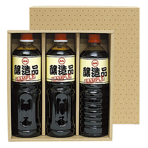 1Lサイズのペットボトルが3本入る、仕切り付きのギフトボックス。クラフトを基調とした温かみのある仕様で、蓋には水玉模様があしらわれています。お醤油やみりん、油といった調味料などのギフトセット梱包にいかがでしょうか。