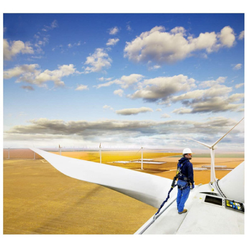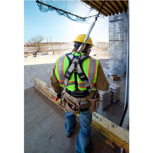 軽量で邪魔になりにくく折りたたみ式のショックアブソーバにより、落下時の衝撃を効果的に吸収する、墜落制止用器具規格適合フルハーネス用の伸縮式ランヤード。