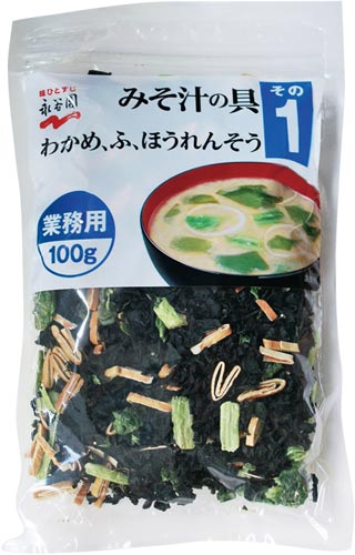 わかめ、ふ、ほうれんそうの乾燥具をミックスしたおみそ汁の具です。直接おみそ汁に入れるだけの簡単タイプです。お好みに合わせて量を調節してください。たっぷり100g入り、1袋約100食分です。