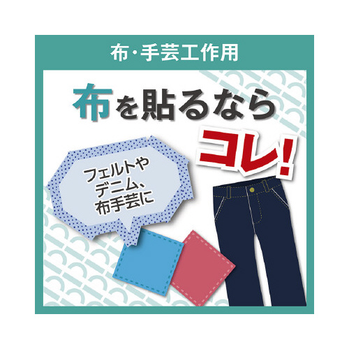 デニムやフェルトにもしっかり接着する布用。布と布・布と紙・木・アップリケとの接着や、手芸用としてリボン・アップリケ等の接着にお使いいただけます。