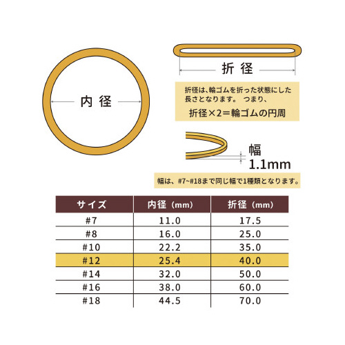 ※推奨結束範囲は、1重巻きを想定した場合の結束したい物の外周参考値となります。<保管・使用上の注意>天然ゴムを使用しています。紫外線や熱を長期間かかる場所でご使用されると輪ゴムが切れる場合がございます。直射日光および高温多湿な場所をさけて保管してください。