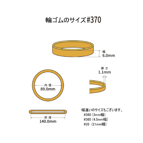 ※推奨結束範囲は、1重巻きを想定した場合の結束したい物の外周参考値となります。<保管・使用上の注意>天然ゴムを使用しています。紫外線や熱を長期間かかる場所でご使用されると輪ゴムが切れる場合がございます。直射日光および高温多湿な場所をさけて保管してください。