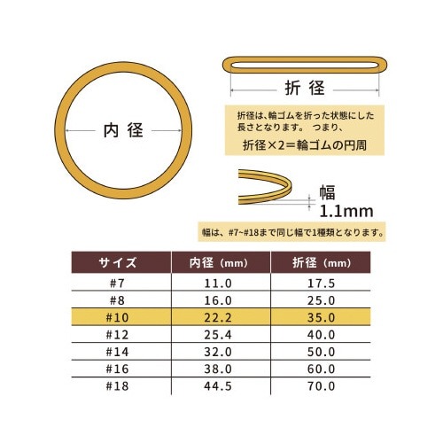 ※推奨結束範囲は、1重巻きを想定した場合の結束したい物の外周参考値となります。<保管・使用上の注意>天然ゴムを使用しています。紫外線や熱を長期間かかる場所でご使用されると輪ゴムが切れる場合がございます。直射日光および高温多湿な場所をさけて保管してください。