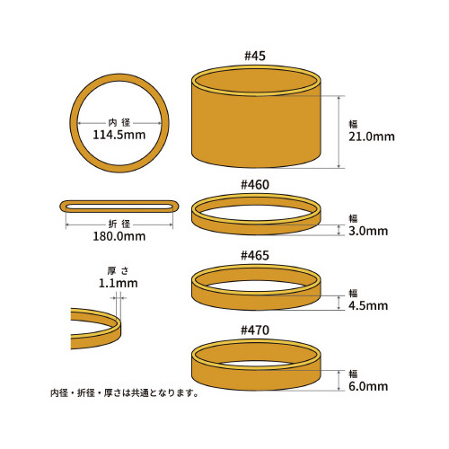 ※推奨結束範囲は、1重巻きを想定した場合の結束したい物の外周参考値となります。結束物の形状や硬さにより変わります。<保管・使用上の注意>天然ゴムを使用しています。ご使用の条件によっては結束物にゴムが付着したり、結束物が変色する場合がまれにあります。電線は束ねたままで通電しないでください。紫外線や熱を長期間かかる場所でご使用されると輪ゴムが切れる場合がございます。直射日光および高温多湿な場所をさけて保管してください。商品の材質、品質保持(くっつき防止や表面保護)などのため、白い粉が付着しております。人体に有害な物質ではないですが、目や口に入らないように十分気をつけて下さい。