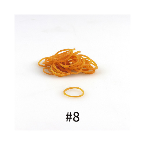 小さいサイズでよく使われる#8(2番目に小さいサイズ)の輪ゴムです。手のひらに収まるくらいのコンパクトな少量箱です。小さいモノを何重にもねじり巻きせずワンタッチで留めたいときにオススメです。