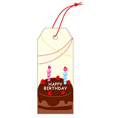 サイズが25×60mmのラッピング用タグ&シール。パーティー風な背景に、バースデーケーキのイラストが描かれています。誕生日プレゼントのラッピングにいかがでしょうか?ラッピングのアクセントとしてもお使いいただけます。