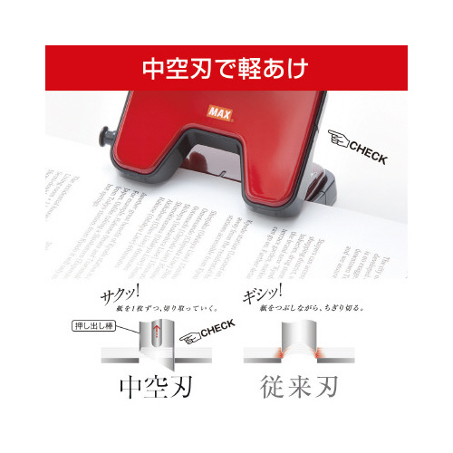 新設計の「中空スライス刃」を採用し、紙を一枚一枚切り抜いていく新感覚軽あけパンチ。パンチの底にすべり止めがついているので作業しやすい。