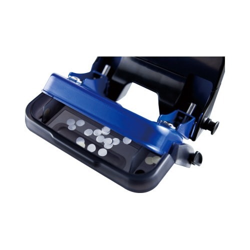 新設計の「中空スライス刃」を採用し、紙を一枚一枚切り抜いていく新感覚軽あけパンチ。パンチの底にすべり止めがついているので作業しやすい。