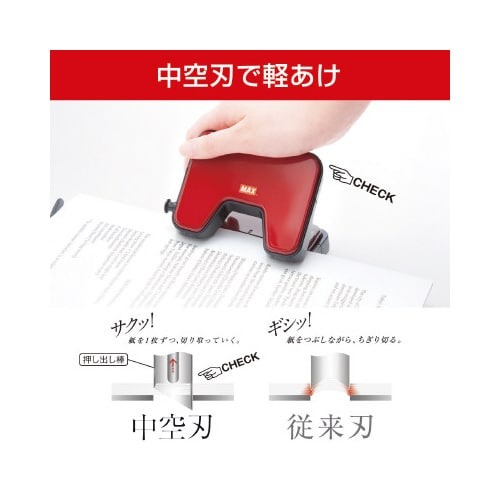新設計の「中空スライス刃」を採用し、紙を一枚一枚切り抜いていく新感覚軽あけパンチ。パンチの底にすべり止めがついているので作業しやすい。