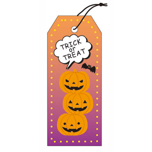 サイズが25×60mmの送り手の気持ちを伝えるメッセージタグです。材質は紙、「TRICK or TREAT」の文字とお化けカボチャ達とコウモリがいる様子が描かれています。ハロウィンのギフトラッピングにピッタリ!大人子ども問わず使えるデザインです。ワンポイントとしてつけるだけでハロウィン仕様になります。