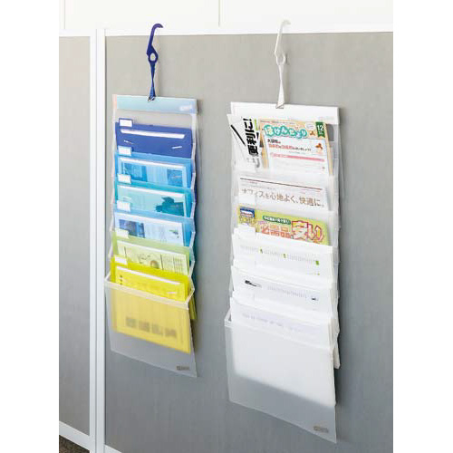 書類を省スペースで分類して収納できる壁掛けファイル。ポケットは取り外せるので、必要な分だけ持ち運びOK。
