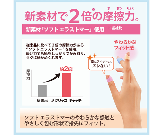 ●新素材で2倍の摩擦力。当社の従来品に比べて2倍の摩擦力がある新素材"ソフト エラストマー"を使用。軽い力でも紙をしっかりつかみとり、ラクに紙がめくれます。