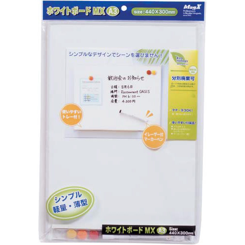 ●付属品/ホワイトボードマーカー(黒・イレーザー付き)1本、トレー(取り外し可能)1個、吊り下げひも、マグネット3個