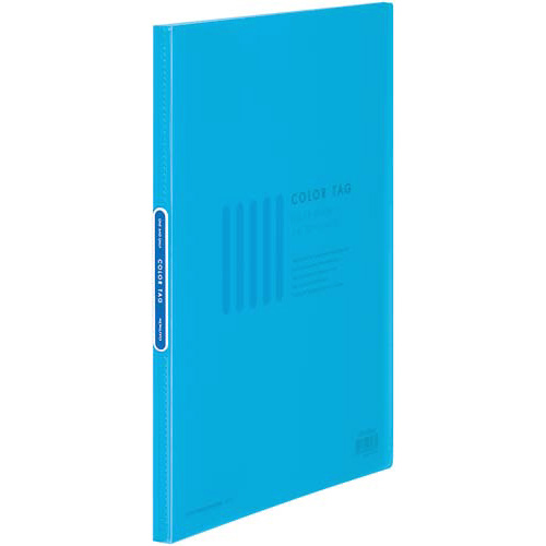 背にカラータグのプレートが付いた「透明のA4クリヤーブック固定式タイプ」です。高透明ポケットで中身の書類が見やすく映えます。