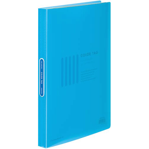 背にカラータグのプレートが付いた「透明のA4クリヤーブック固定式タイプ」です。高透明ポケットで中身の書類が見やすく映えます。