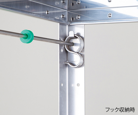 ●本体左右側面には、収納可能な移動式フックが各3箇所付いており、別途「フックで吊り下げ」商品や、ゴミ袋など任意で取りつけ出来ます。