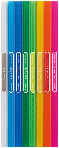 背にカラータグのプレートが付いた「透明のA4クリヤーブック固定式タイプ」です。高透明ポケットで中身の書類が見やすく映えます。