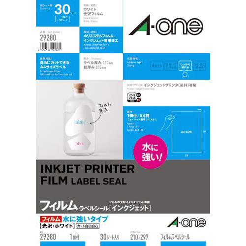 インクジェットプリンタ(IJP)で印刷できる、水に強い耐水光沢ホワイトフィルム素材のラベルシールです。水に濡れてもインクがにじみにくい特殊加工を施しています。パッケージ、ラッピングシール作成に。