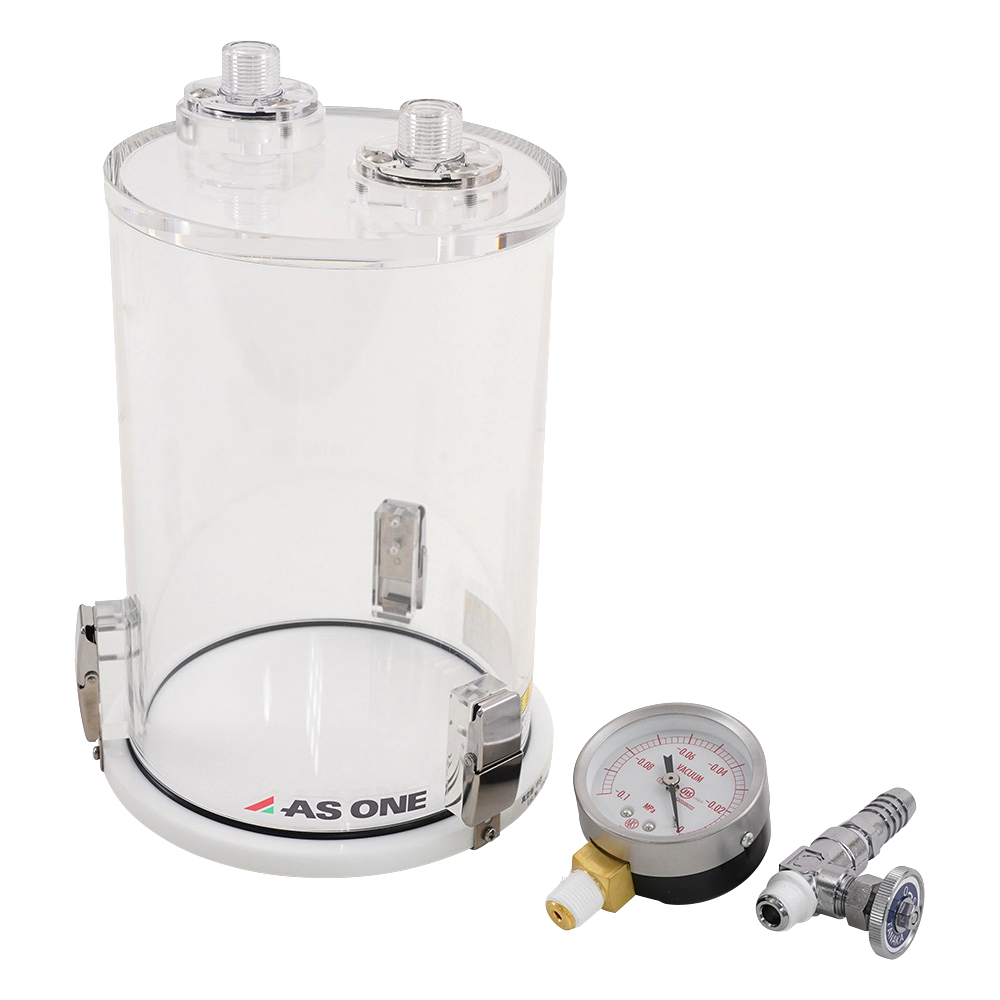 ●本体材質:胴部/透明強化PMMA(アクリル)板厚5mm、天板・底板/強化PMMA(アクリル)板厚10mm、バルブ・真空計取り付け部/PC(ポリカーボネート)