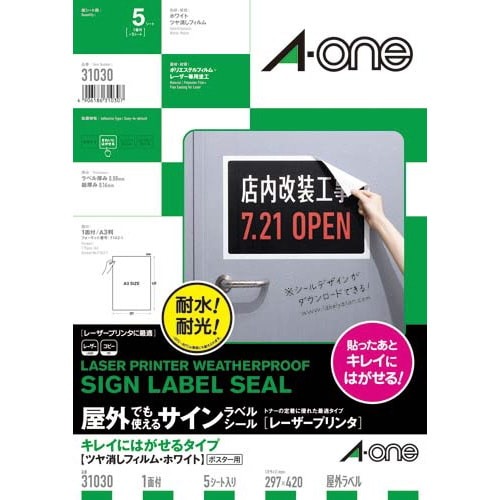 レーザープリンタ(LBP)で印刷できる、屋外でも使えるホワイトツヤ消しフィルム素材のラベルシールです。しっかり貼れてキレイにはがせる糊を使用。A3サイズ。耐水性、耐光性に優れています。