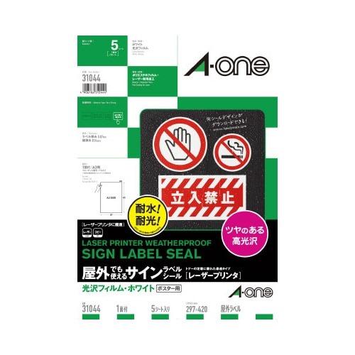 レーザープリンタ(LBP)で印刷できる、屋外でも使えるホワイト光沢フィルム素材のラベルシールです。A3サイズ。耐水性、耐光性に優れています。
