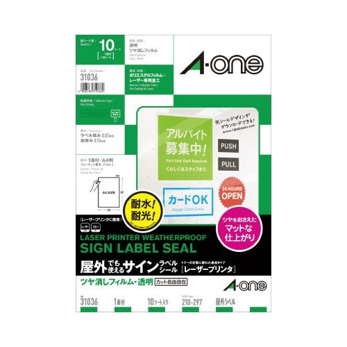 レーザープリンタ(LBP)で印刷できる、屋外でも使える透明ツヤ消しフィルム素材のラベルシールです。耐水性、耐光性に優れています。