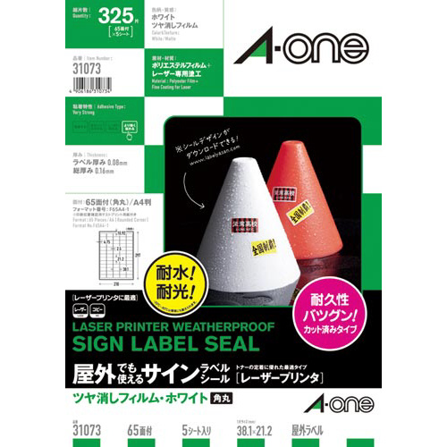レーザープリンタ(LBP)で印刷できる、屋外でも使えるホワイトツヤ消しフィルム素材のラベルシールです。耐水性、耐光性に優れています。