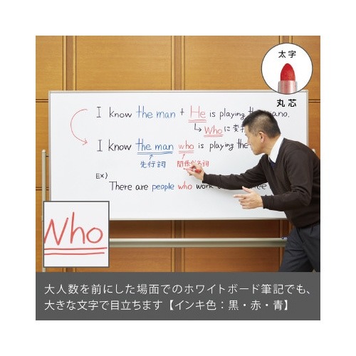 大きな会議室や教室などでおすすめ!インクが薄くなったらすぐプッシュ!最後までみずみずしい鮮やかな筆記の直液式。インク残量が見える表示窓付き。