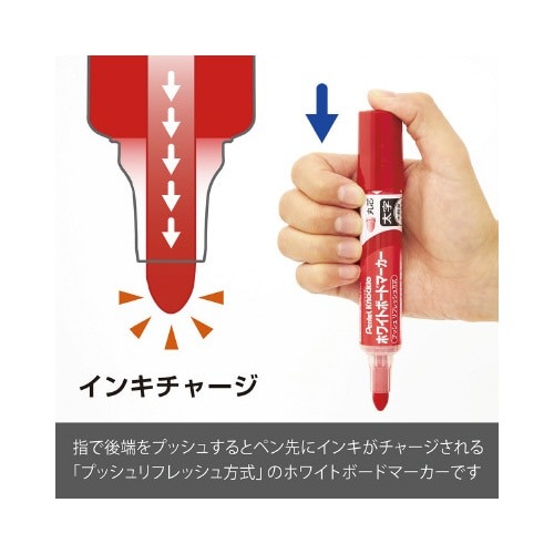 大きな会議室や教室などでおすすめ!インクが薄くなったらすぐプッシュ!最後までみずみずしい鮮やかな筆記の直液式。インク残量が見える表示窓付き。