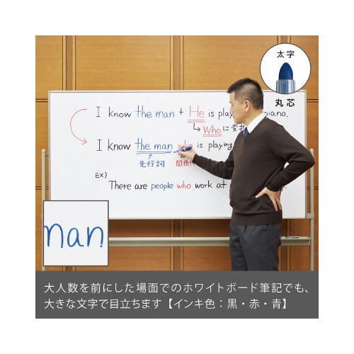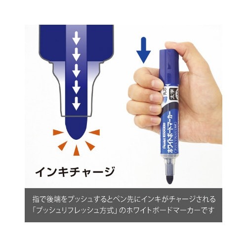 大きな会議室や教室などでおすすめ!インクが薄くなったらすぐプッシュ!最後までみずみずしい鮮やかな筆記の直液式。インク残量が見える表示窓付き。