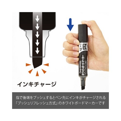 大きな会議室や教室などでおすすめ!インクが薄くなったらすぐプッシュ!最後までみずみずしい鮮やかな筆記の直液式。インク残量が見える表示窓付き。