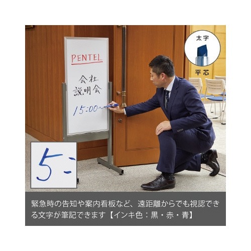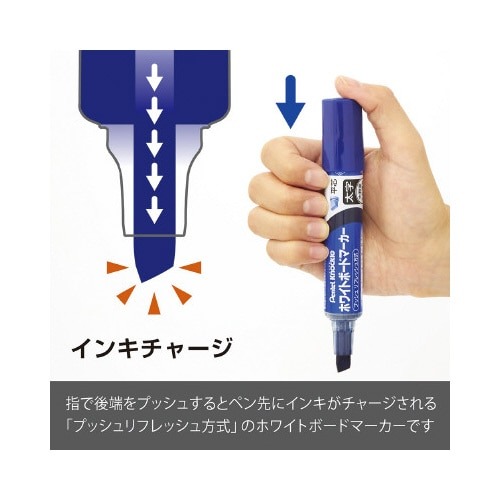 大きな会議室や教室などでおすすめ!インクが薄くなったらすぐプッシュ!最後までみずみずしい鮮やかな筆記の直液式。インク残量が見える表示窓付き。