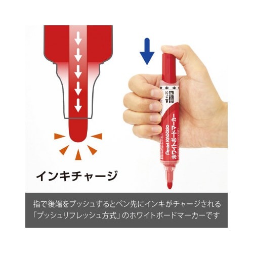 大きな会議室や教室などでおすすめ!インクが薄くなったらすぐプッシュ!最後までみずみずしい鮮やかな筆記の直液式。インク残量が見える表示窓付き。