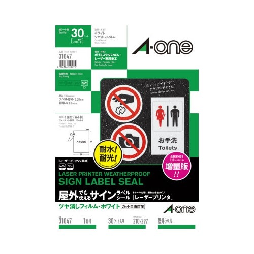 レーザープリンタ(LBP)で印刷できる、屋外でも使えるホワイトツヤ消しフィルム素材のラベルシールです。耐水性、耐光性に優れています。