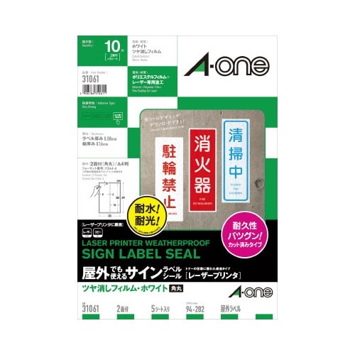 レーザープリンタ(LBP)で印刷できる、屋外でも使えるホワイトツヤ消しフィルム素材のラベルシールです。耐水性、耐光性に優れています。