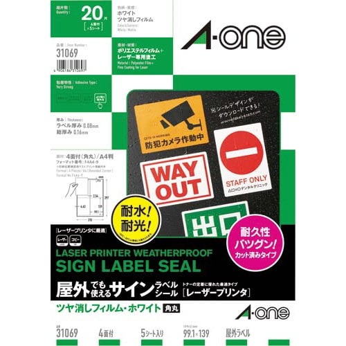 レーザープリンタ(LBP)で印刷できる、屋外でも使えるホワイトツヤ消しフィルム素材のラベルシールです。耐水性、耐光性に優れています。