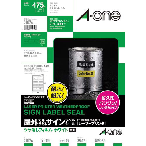 レーザープリンタ(LBP)で印刷できる、屋外でも使えるホワイトツヤ消しフィルム素材のラベルシールです。耐水性、耐光性に優れています。