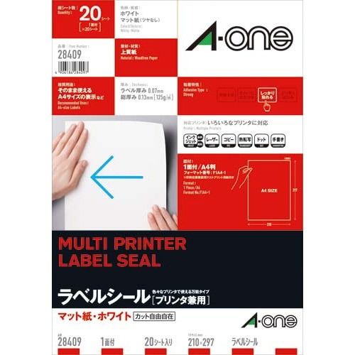 各種プリンタ兼用で印刷できる、上質紙素材のラベルシールです。ノーカットなので自由に切って使えます。「エーワン」の定番紙ラベル。